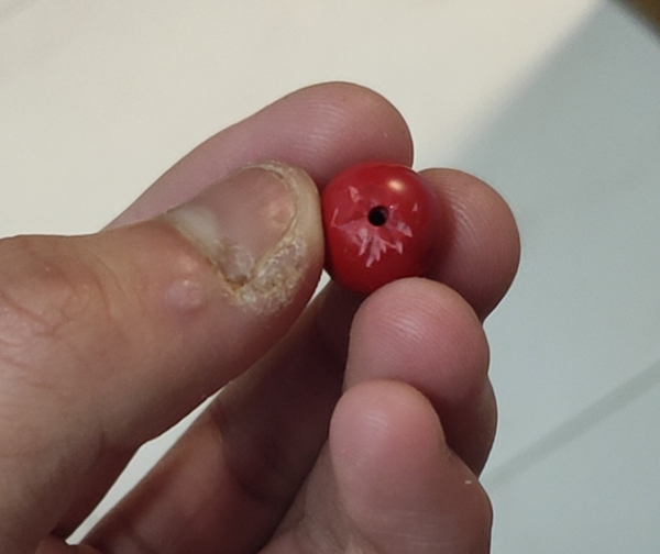 第二、看颜色,表面是红色,顶部和底部有黑颗粒:偏重塑料加铅加外喷漆。